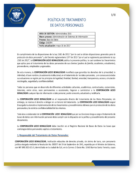 En cumplimiento de las disposiciones de la Ley 1581 de 2012 “por la cual se dictan disposiciones generales para la protección de datos personales” y del Decreto reglamentario 1377 de 2013 “por el cual se reglamenta parcialmente la Ley 1581 de 2012”, la CORPORACIÓN LICEO BENALCÁZAR publica la presente política, la cual contiene los lineamientos que aplica para el tratamiento de los datos personales de sus clientes (padres de familia, acudientes, estudiantes), proveedores, empleados y egresadas.